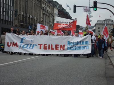Wir fordern den Senat und die Parteien in der Hamburgischen Bürgerschaft auf, ihre politischen Initiativen zur Wiedereinführung der Vermögenssteuer mit einem noch stärkeren Nachdruck zu betreiben bzw. sich dort anzuschließen. Zu einer gerechten Steuerpolitik gehören eine sofortige Vermögensabgabe, eine Vermögenssteuer, eine Verstärkung der Erbschaftssteuer oberhalb bestimmter Sätze, eine Bekämpfung der Finanzspekulation durch eine Transaktionssteuer, eine Anhebung des Spitzensteuersatzes, eine verstärkte Besteuerung von nicht reinvestierten Gewinnen und nicht zuletzt der massive Ausbau von Steuerprüfungen zur Verbesserung des Steuervollzugs.