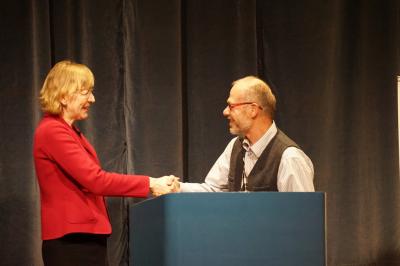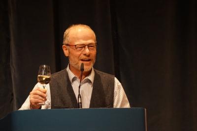 Nach der Rede von Senatorin Dorothee Stapelfeldt (SPD) bedankte sich Matthias Maurer herzlich - und mit zwei Flaschen Wein.